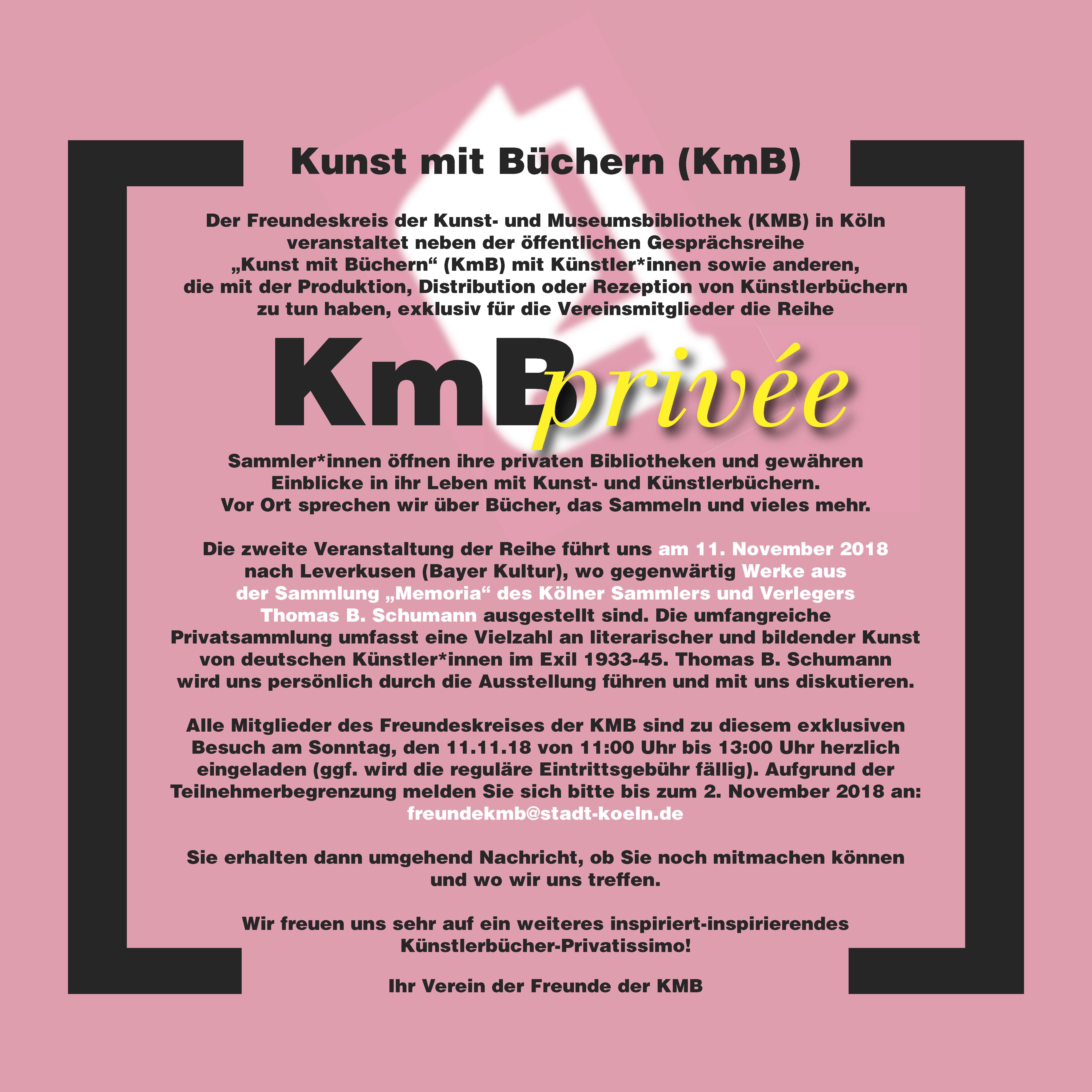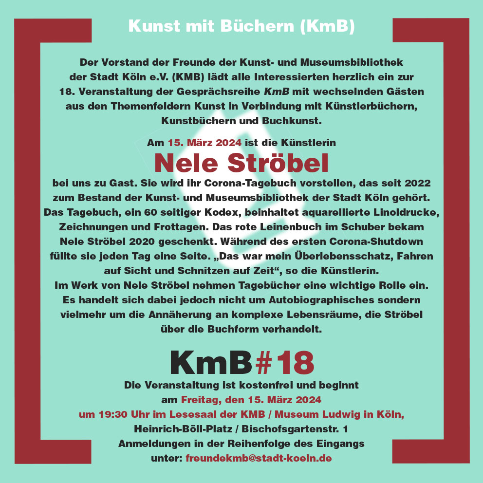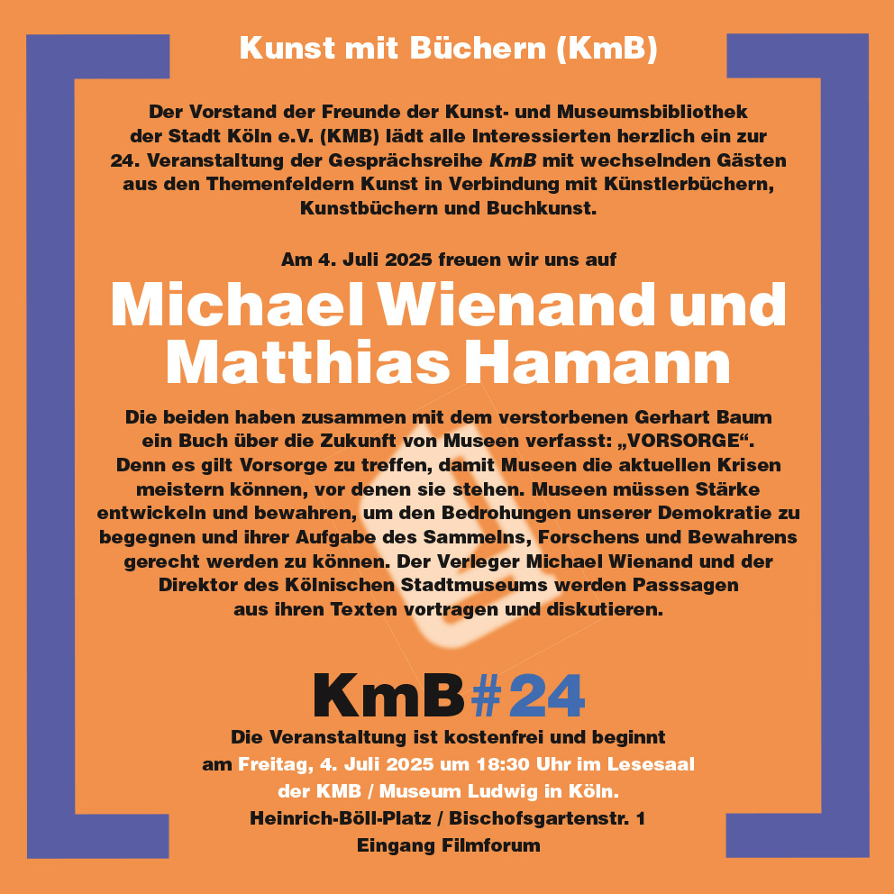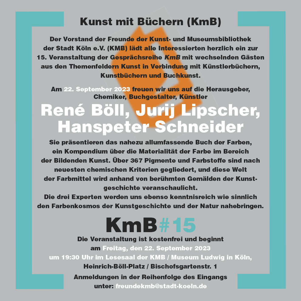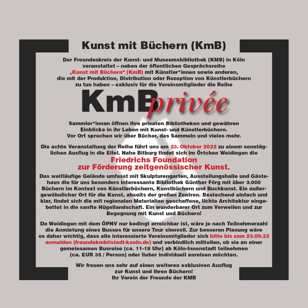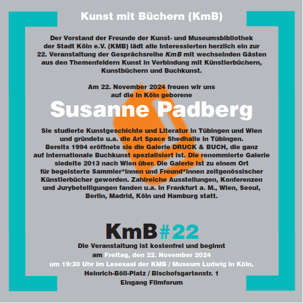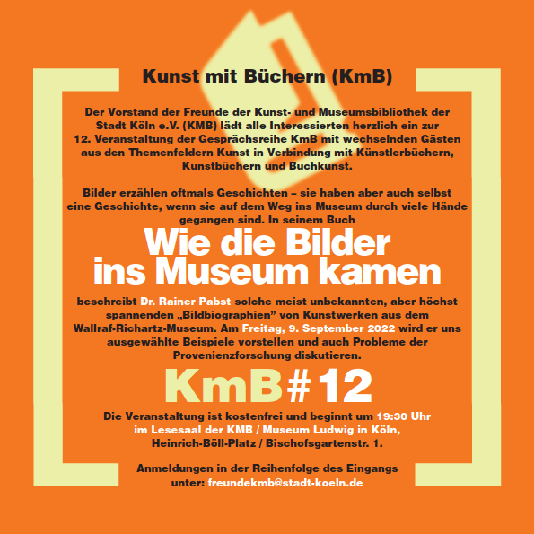 Die Veranstaltung findet statt in der Reihe "Kunst mit Büchern". Sie ist kostenfrei und beginnt um 19 Uhr im ZADIK, Im Mediapark 7, 50670 Köln. Die Mitglieder der beiden Fördervereine sind exklusiv zum Sektempfang ab 18.30 Uhr eingeladen.