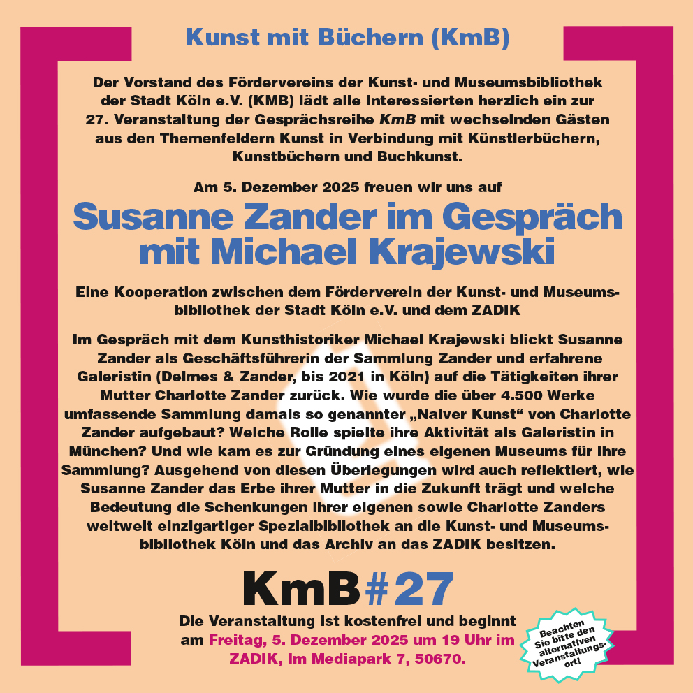 Am Freitag, 5. Dezember 2025 freuen wir uns auf Susanne Zander im Gespräch mit Michael Krajewski - eine Kooperation zwischen dem Förderverein der Kunst- und Museumsbibliothek und dem ZADIK.